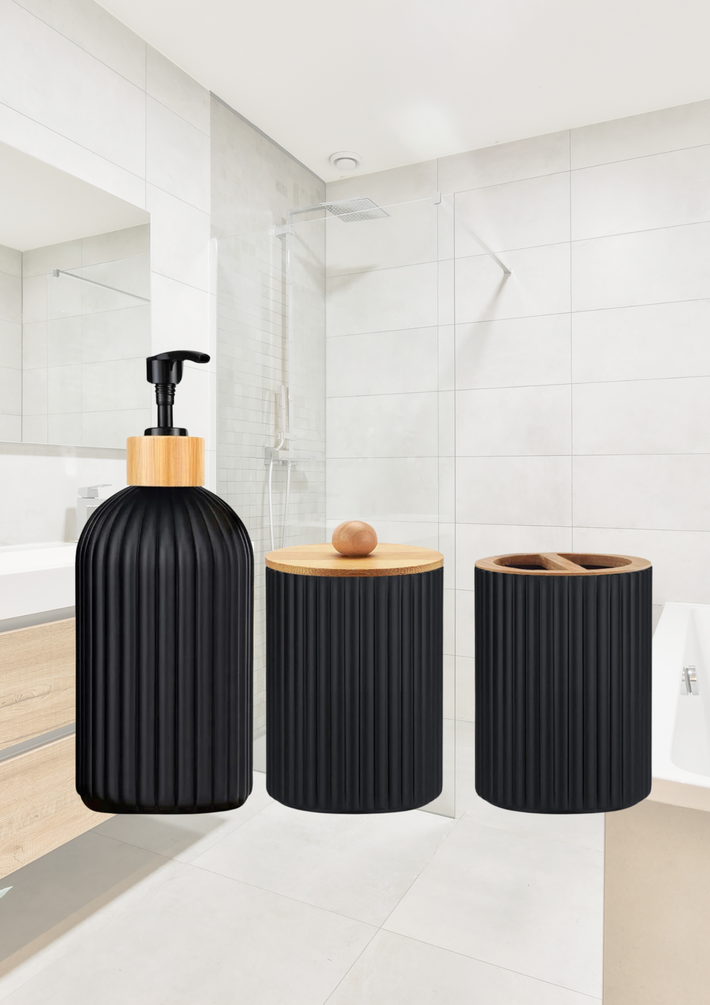 🖤 Edles Design: Die gerillte Oberfläche in Schwarz und der Bambus-Akzent verleihen deinem Bad eine luxuriöse Note.