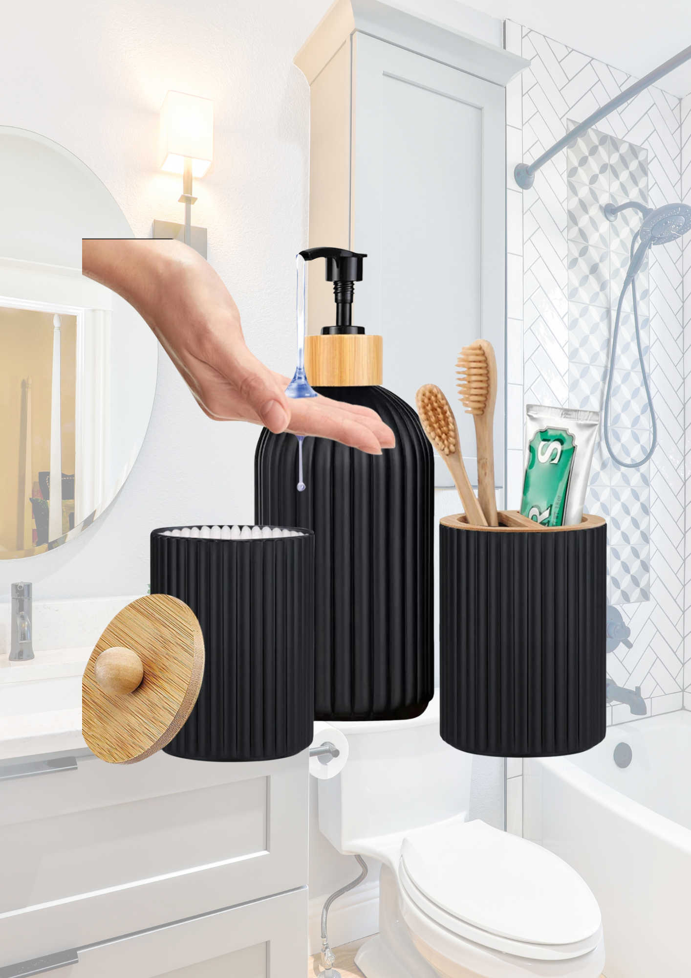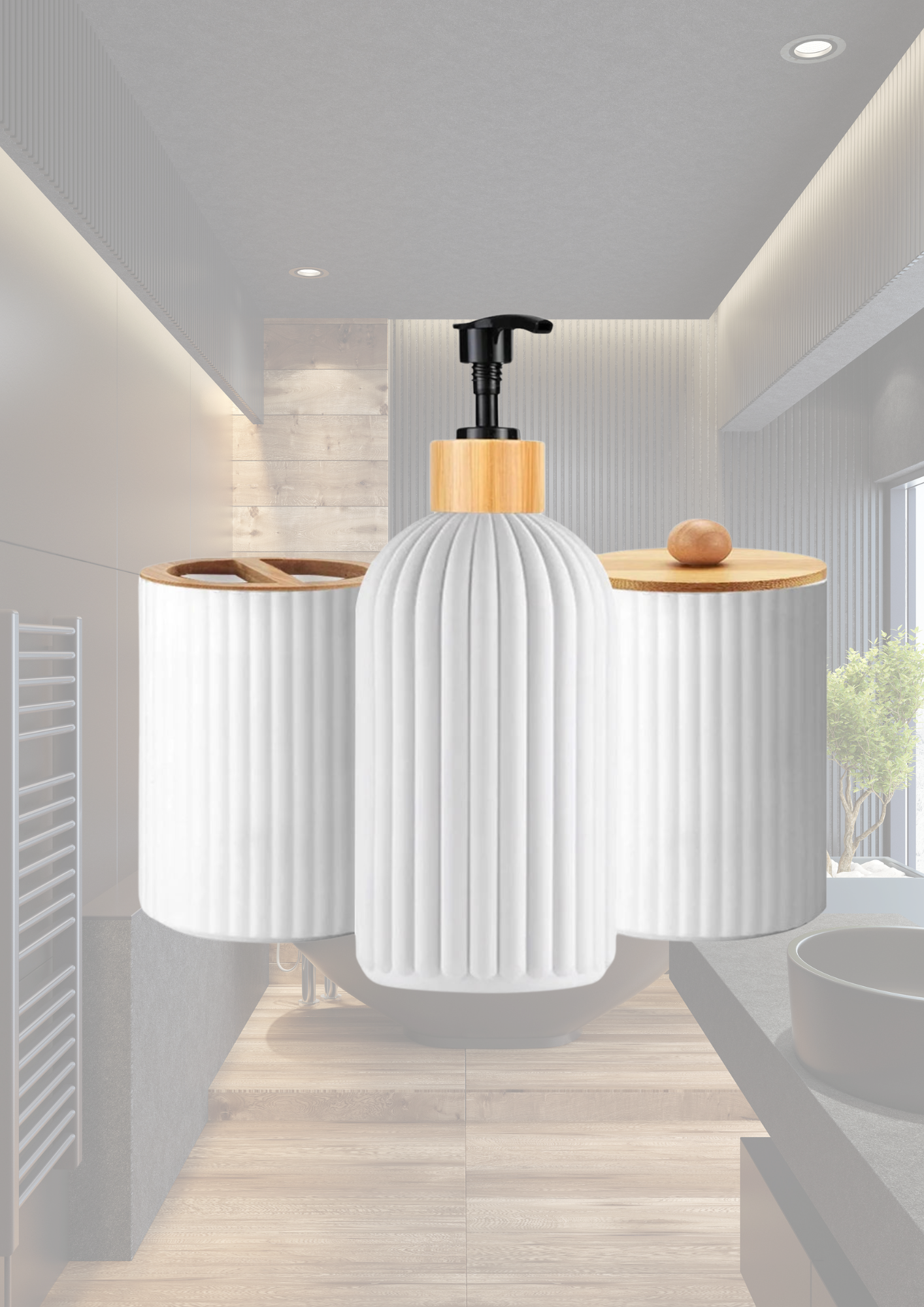 Bring Eleganz und Ordnung in dein Badezimmer mit dem ElegantEco Badezimmer-Set. Dieses Set kombiniert modernes Design mit natürlichen Materialien, um deinen Alltag zu verschönern. 🌟 Bestehend aus einem Seifenspender, einem Wattestäbchen-Behälter und einem Zahnputzbecher, ist es das perfekte Trio für ein stilvoll organisiertes Bad. 🛁✨